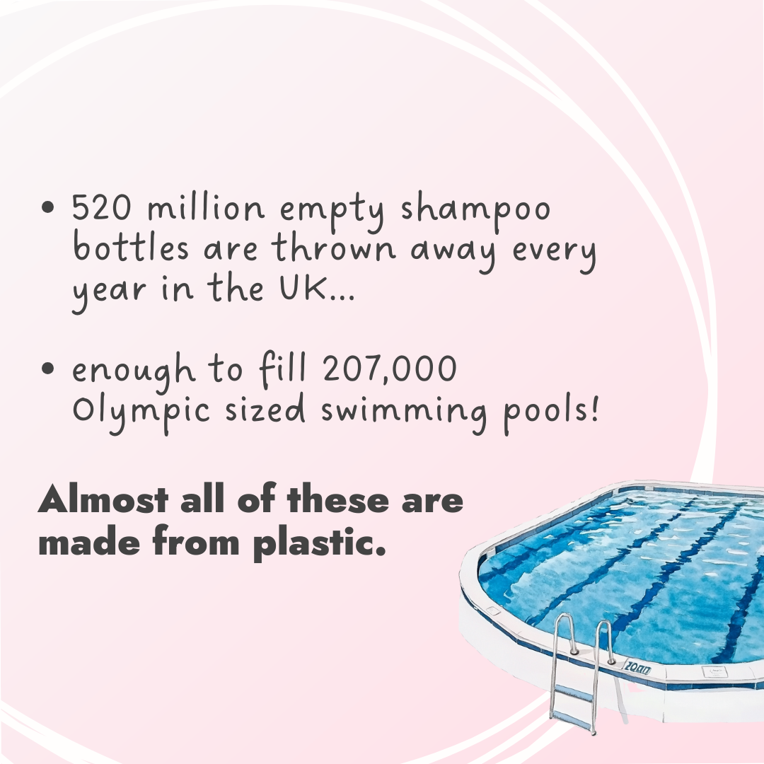 520 million empty shampoo bottles are thrown away every year in the UK - enough to fill 207,000 Olympic sized swimming pools. And that staggering number doesn’t even include conditioner, body wash, or other bathing products - just shampoo bottles alone.