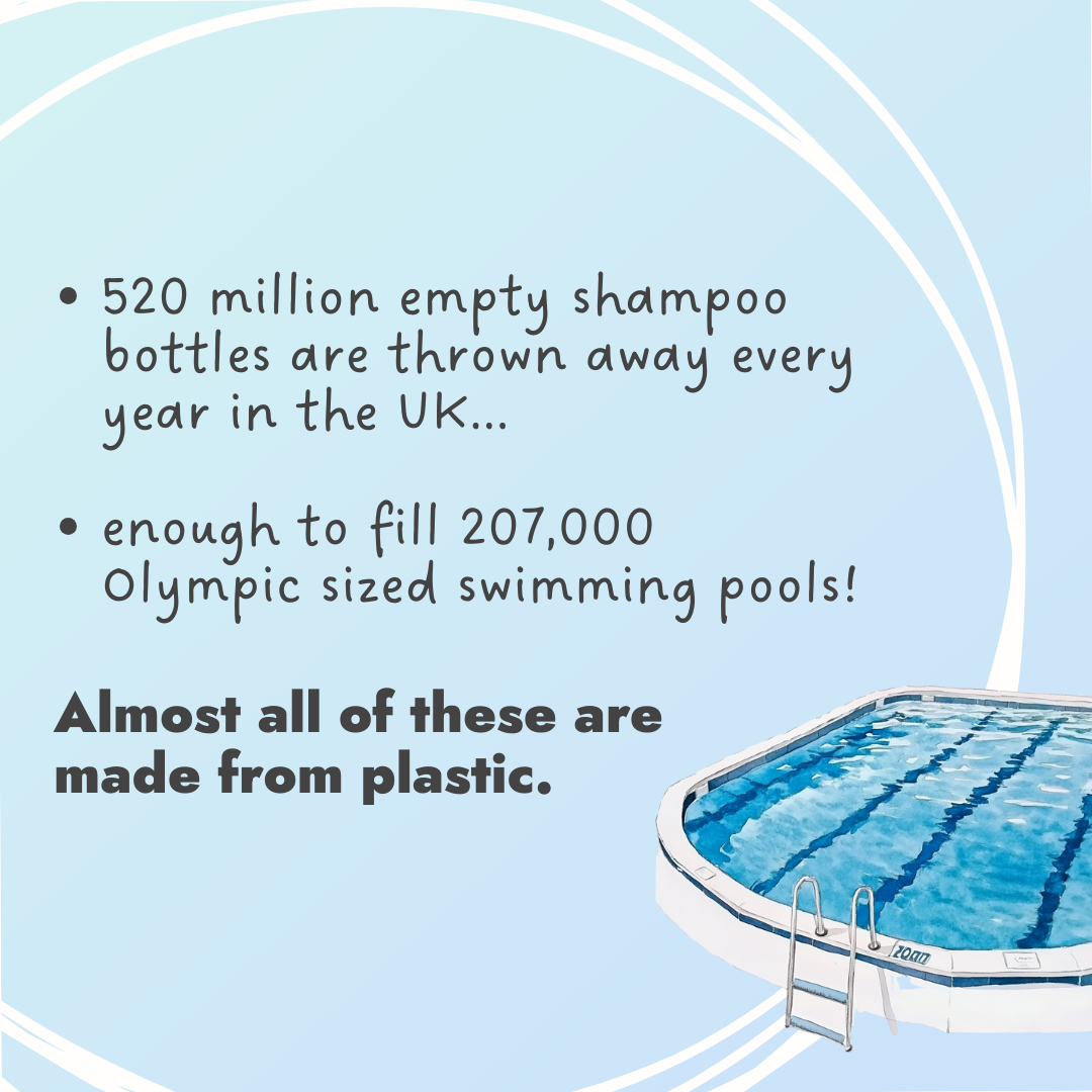 520 million empty shampoo bottles are thrown away every year in the UK - enough to fill 207,000 Olympic sized swimming pools. And that staggering number doesn’t even include conditioner, body wash, or other bathing products - just shampoo bottles alone.